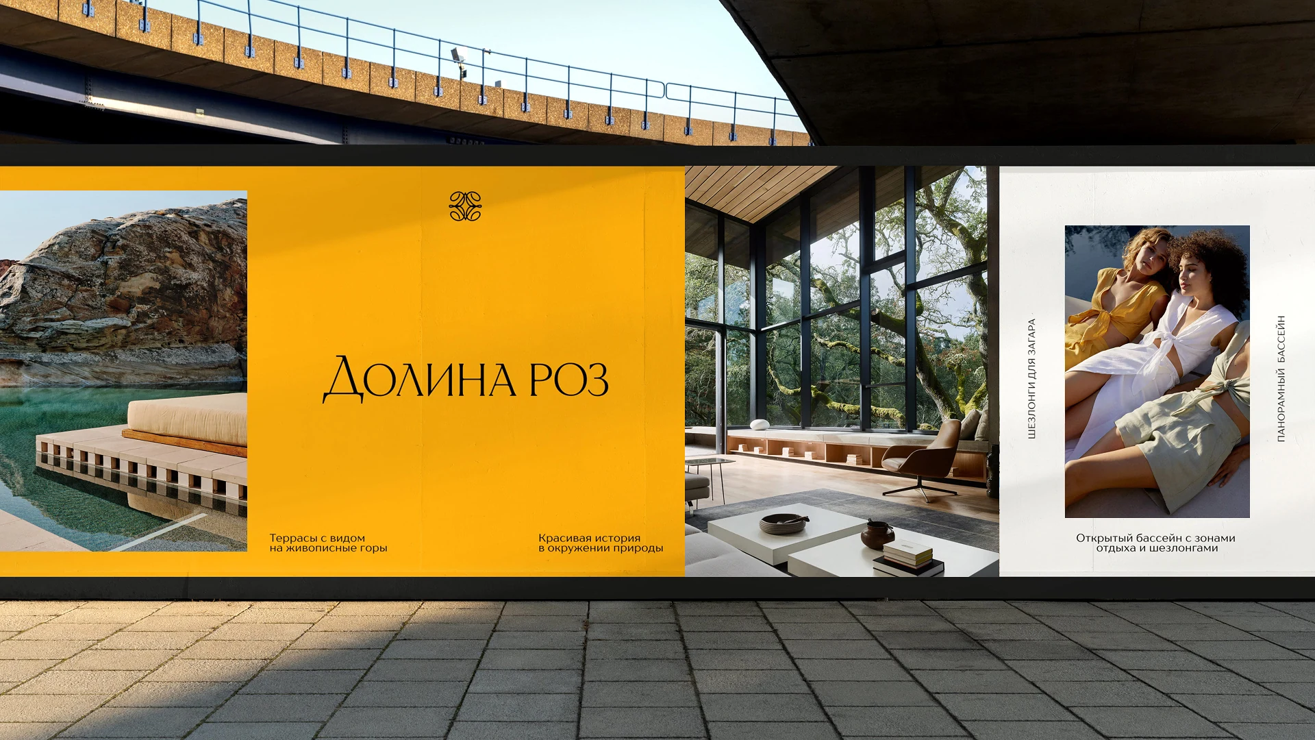 Долина Роз — один из самых живописных проектов Крыма в окружении моря и гор. В основе концепции лежит вдохновение средиземноморской эстетикой. Отправляясь в южное путешествие, мы всегда ищем особенную атмосферу, которая вдохновляет нас и наполняет энергией. Все детали бренда — имиджевые слоганы и элементы дизайна — призваны передать солнечное настроение Крыма и создать мечту о счастливой жизни на берегу моря. Средиземноморский жёлтый цвет отражает солнечное и южное настроение “Долины роз”.