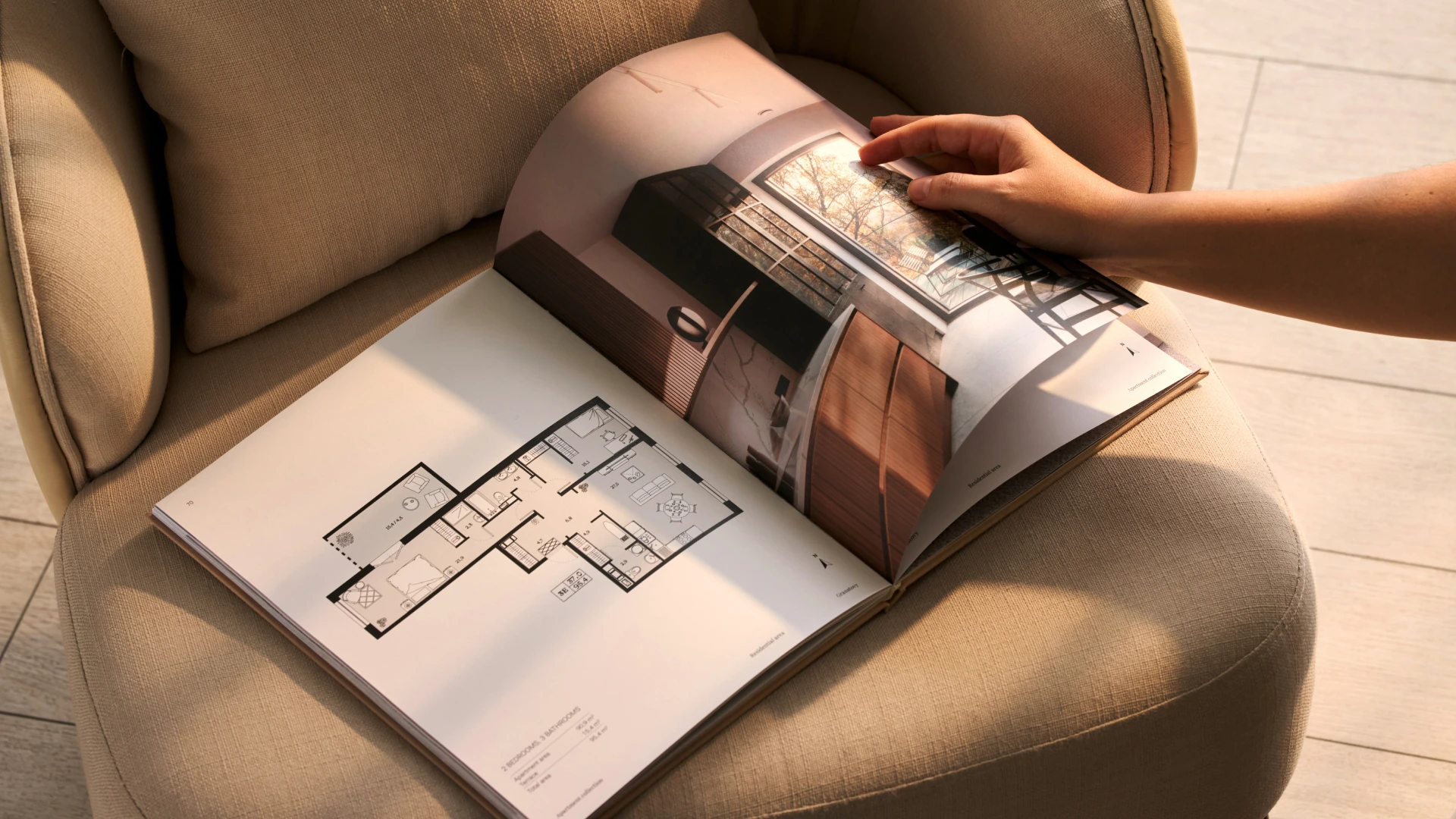 Для проекта сделаны: вёрстка и весь контент для имиджевого буклета: тексты, иллюстрации, 3Д визуализации, отрисовка планировочных решений, а также производство всего тиража.