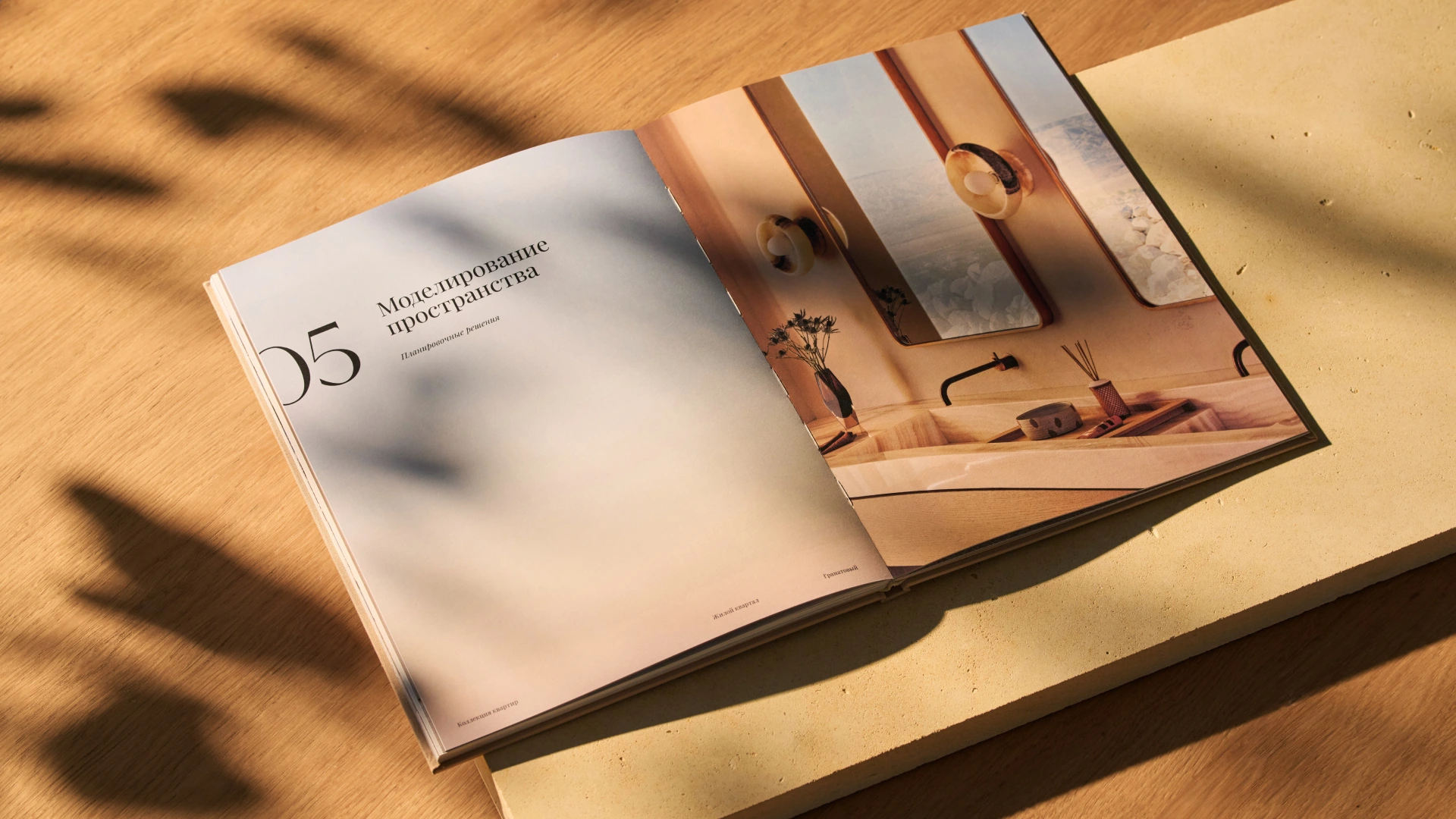 В качестве формата была выбрана эстетика интерьерных альбомов: каждая деталь буклета поддерживает атмосферу отдыха и безмятежности. Тёплая цветовая гамма обложек и иллюстраций перекликается с песочными цветами архитектуры: традиционно дома в Дербенте облицовывают местным камнем — ракушечником. Шмуцтитулы с декоративным градиентом выполнены в оттенках каспийского побережья. Гармония тканых и глянцевых фактур, утончённая типографика и полупрозрачная калька подчеркивают эстетику бренда EFFECT development.