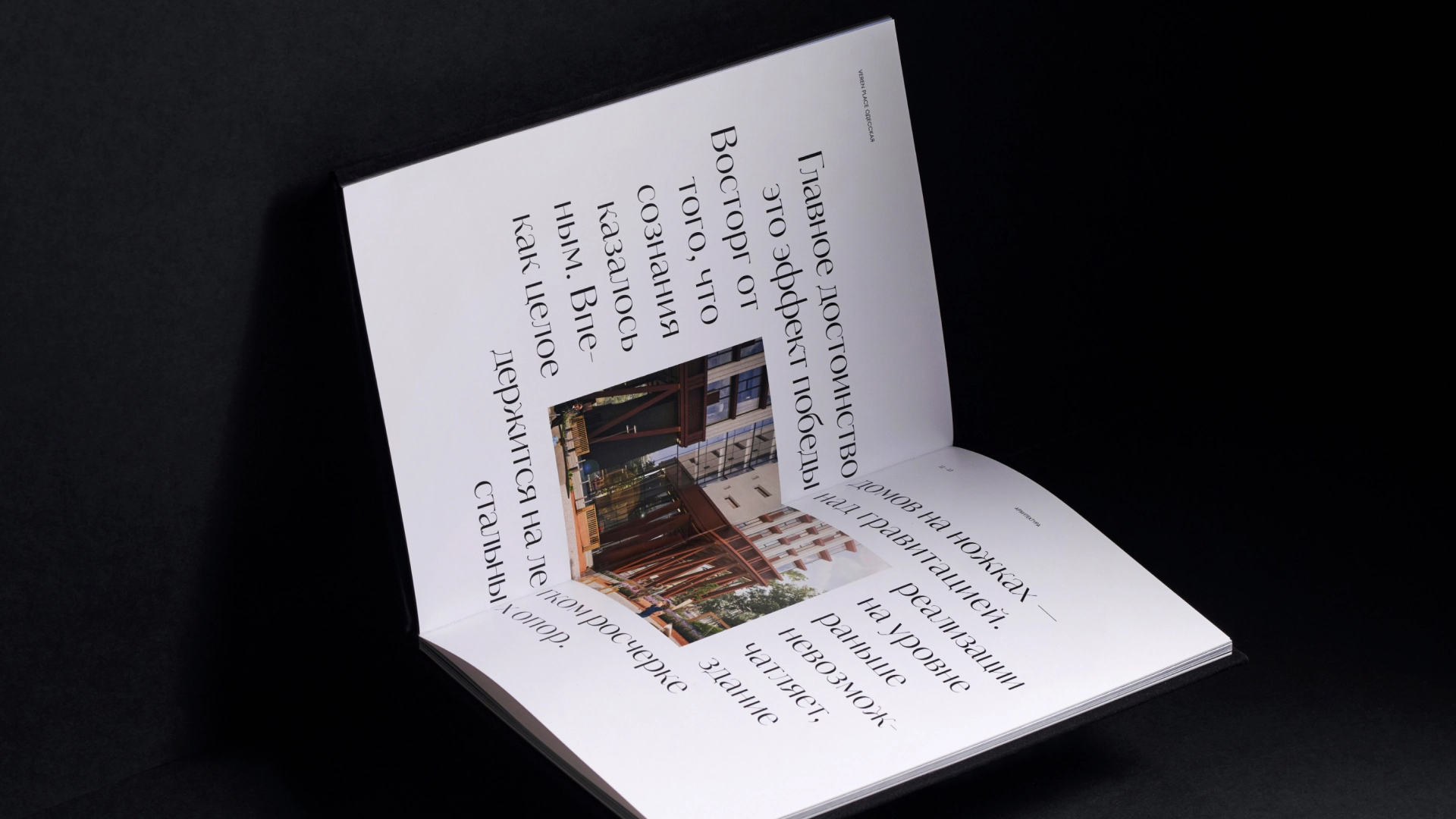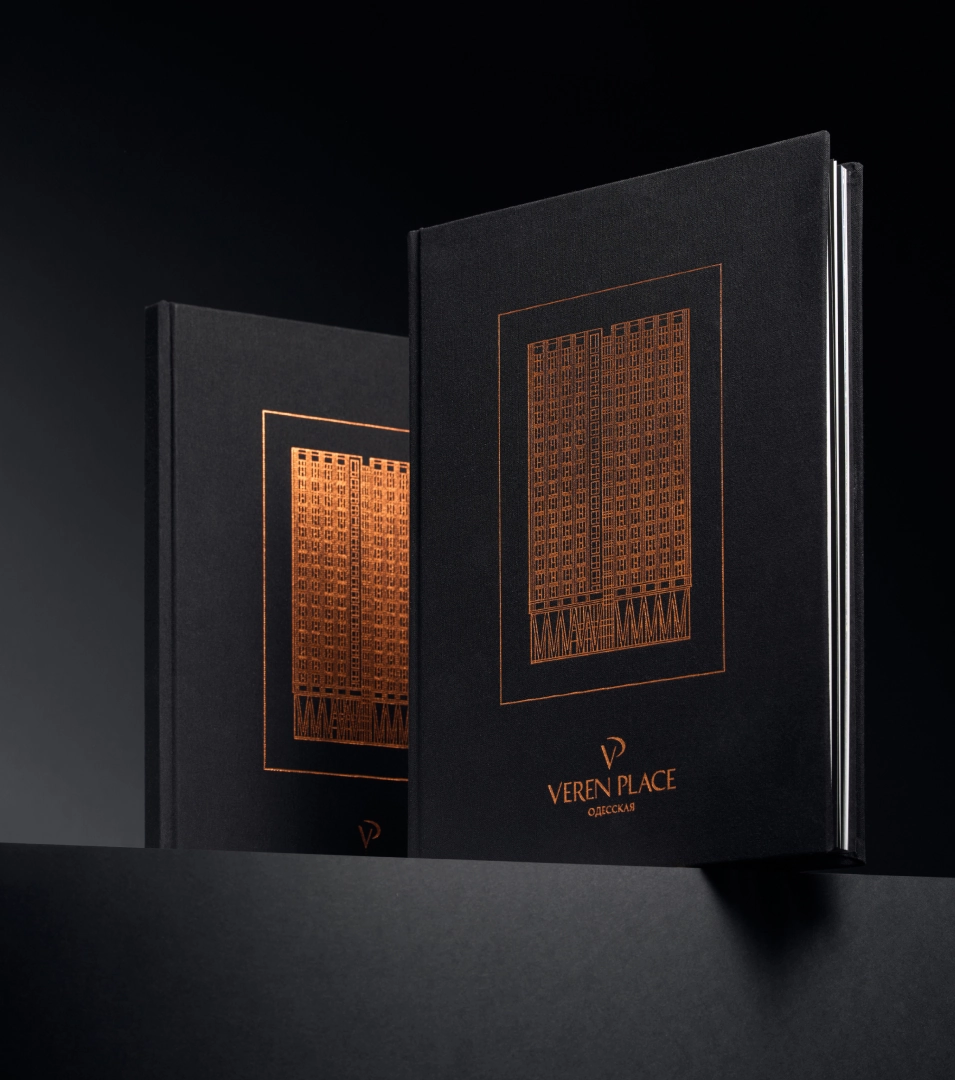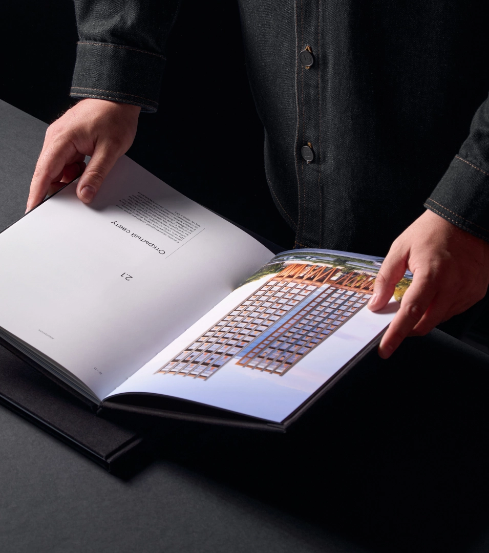 Прежде всего, в буклете мы решили подчеркнуть главное и отказаться от всего лишнего. Главным стала красота архитектуры. Она воплотилась в инженерной графике, которую с помощью тиснения мы нанесли на тканую обложку. Медный оттенок фольги — это отсылка к стали Cor-ten, из которой выполнены опоры. Формат издания вдохновлён интерьерными книгами и придаёт буклету коллекционную ценность.